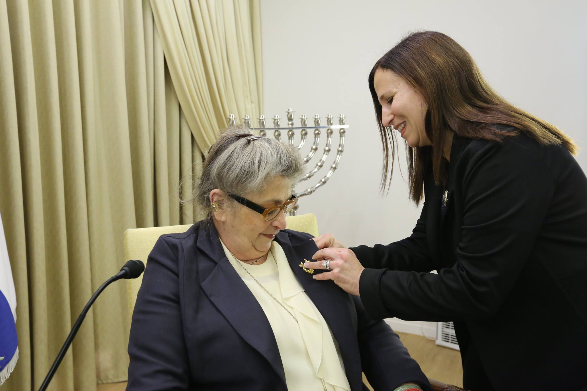 Women's Division Chair Shira Lewis presented First Lady Nechama Rivlin with the Woman of Valor pin during the 2015 Women's Division delegation. (Photo: Yossi Zamir)