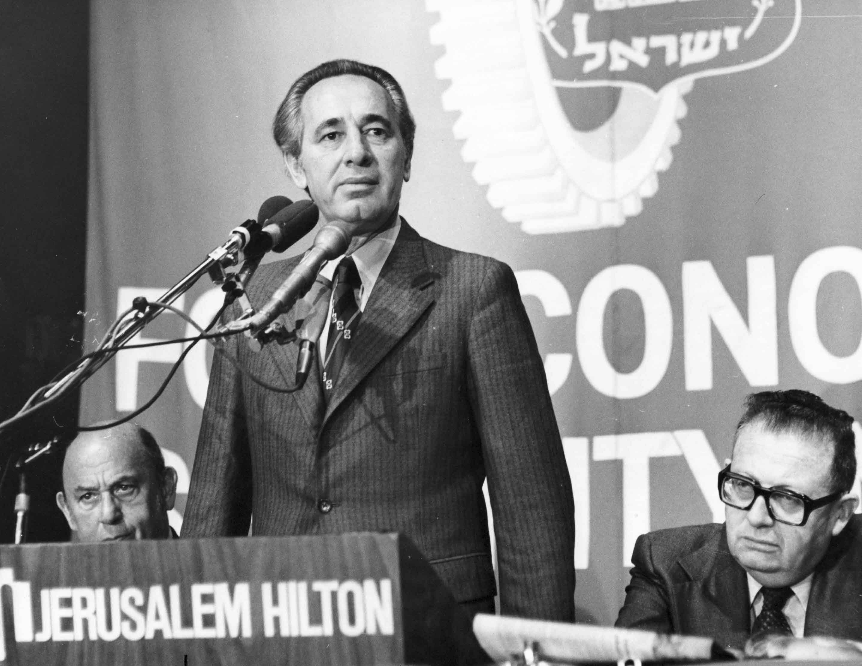 In 1974, Shimon Peres addressed an Israel Bonds delegation in Jerusalem.