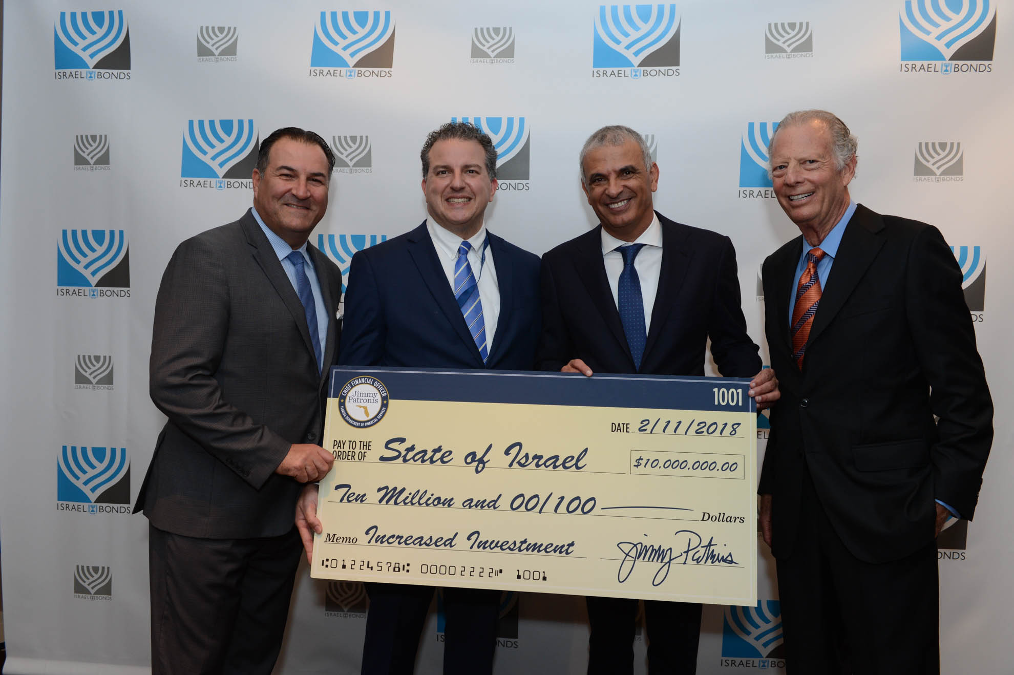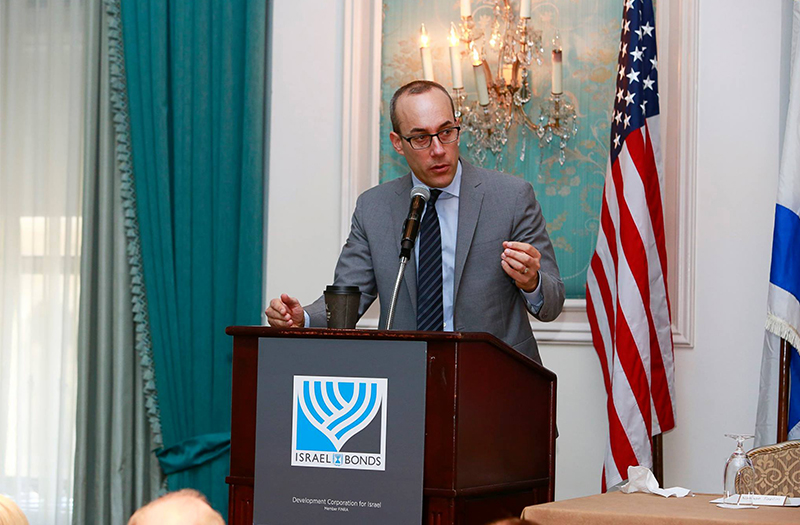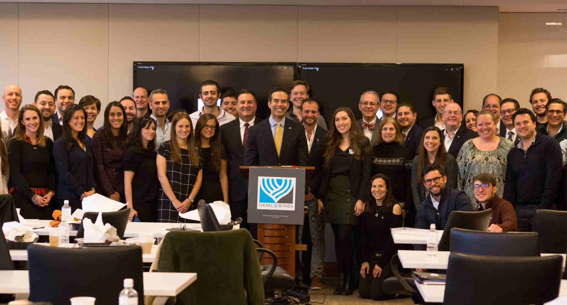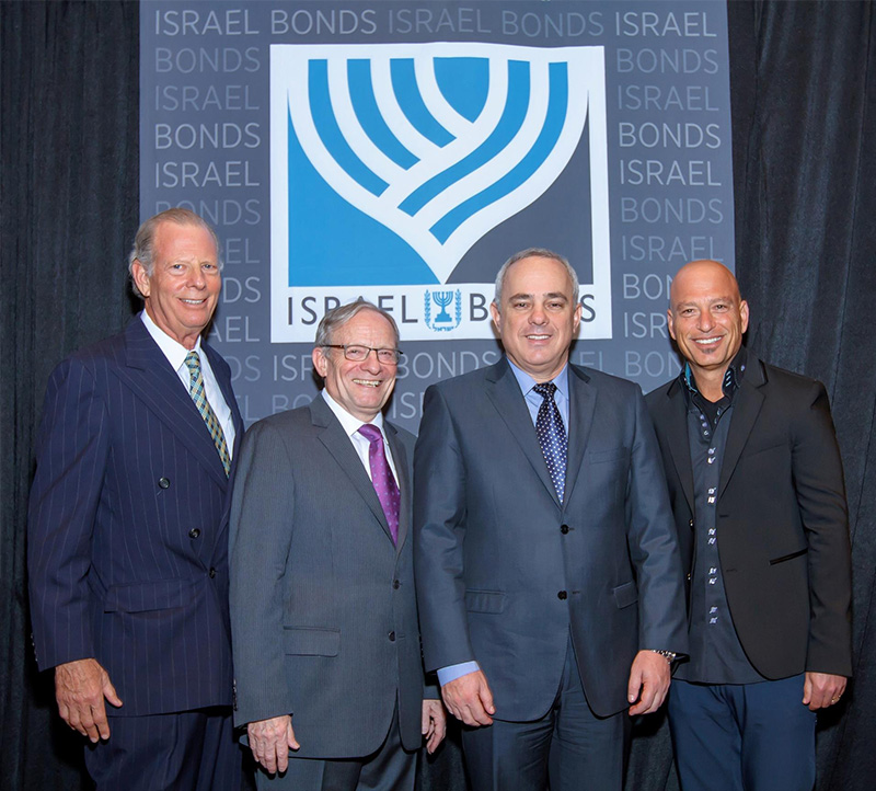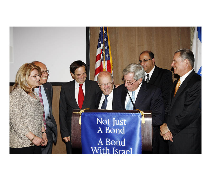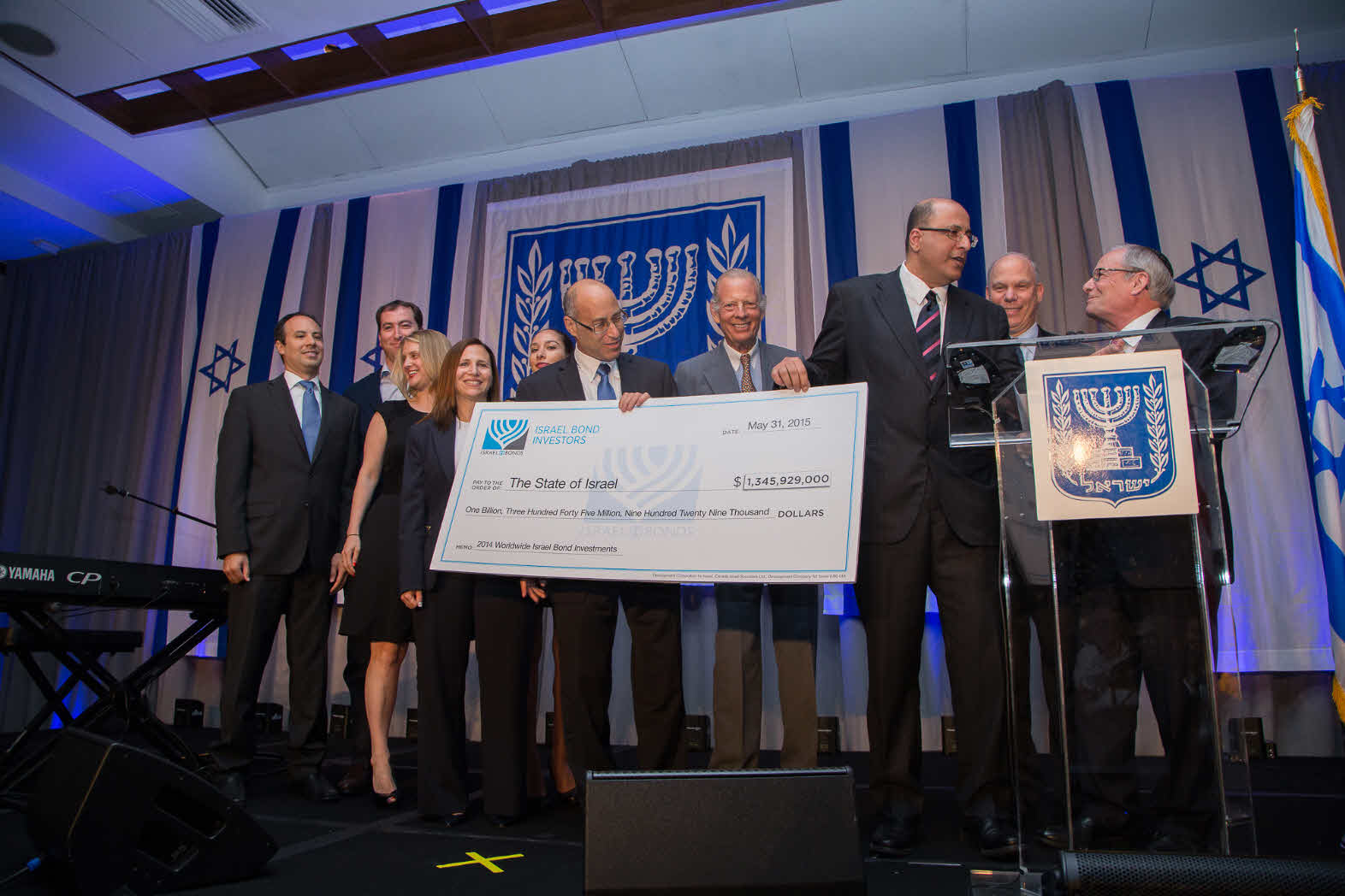 Celebrating Israel's Independence Day in May 2015, Ambassador Ido Aharoni accepted a symbolic check, highlighting worldwide Israel bond sales, from lay leaders and staff including Jason Schwartz, Shira Lewis, Richard L. Hirsch, Stuart Garawitz and Izzy Tapoohi. (Photo: Shahar Azran)