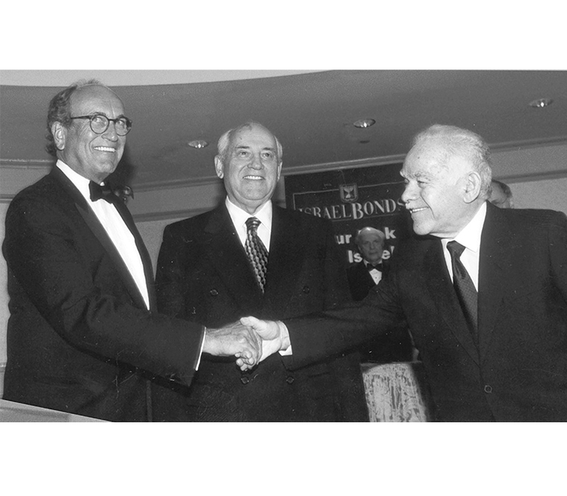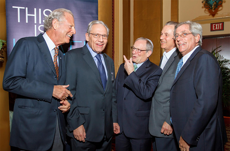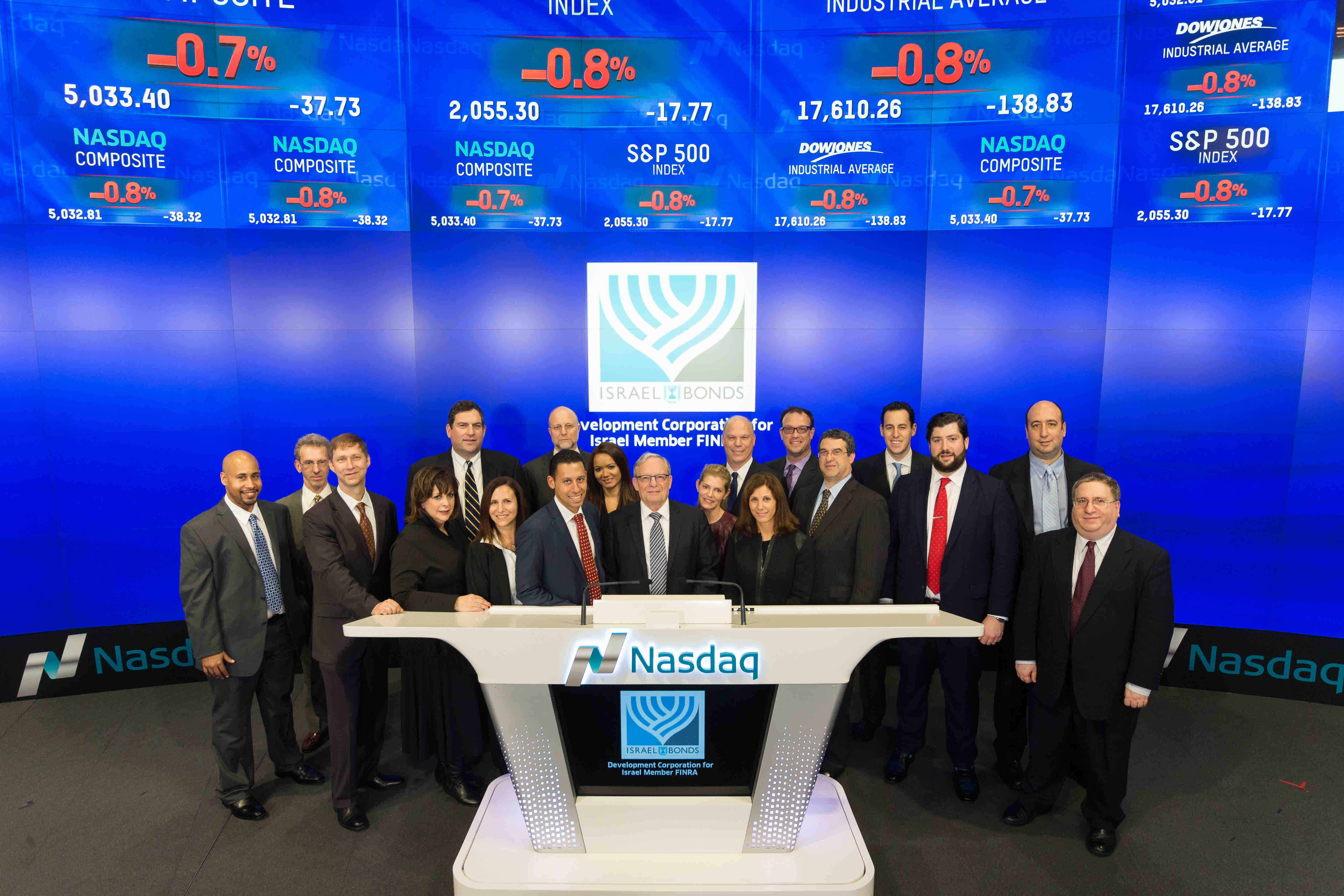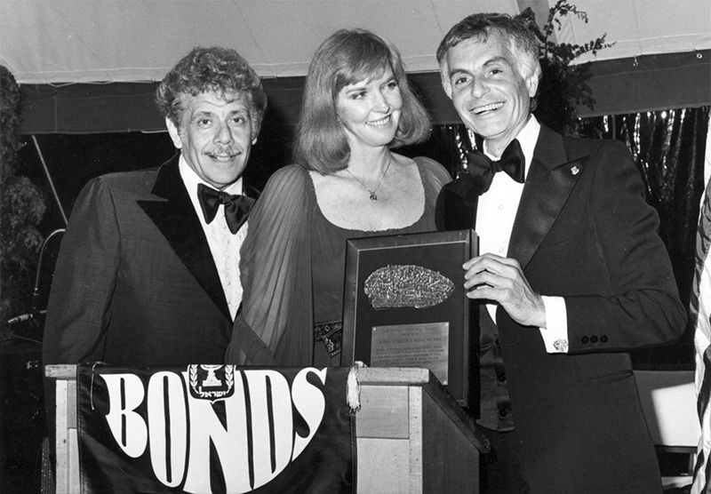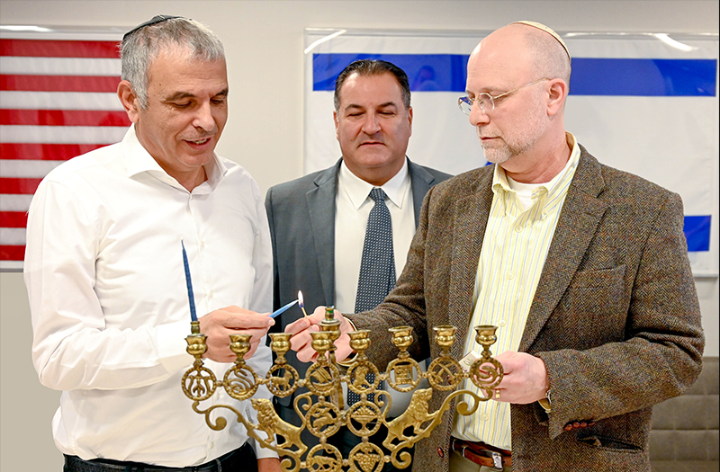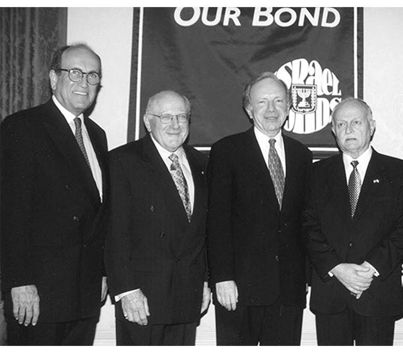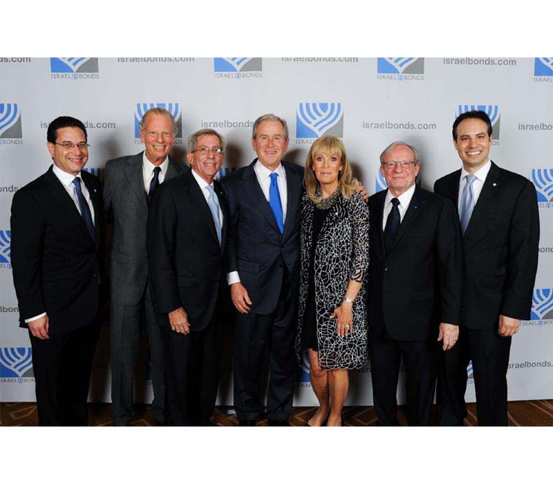 Celebrating Israel's Independence Day in May 2015, Ambassador Ido Aharoni accepted a symbolic check, highlighting worldwide Israel bond sales, from lay leaders and staff including Jason Schwartz, Shira Lewis, Richard L. Hirsch, Stuart Garawitz and Izzy Tapoohi. (Photo: Shahar Azran)
